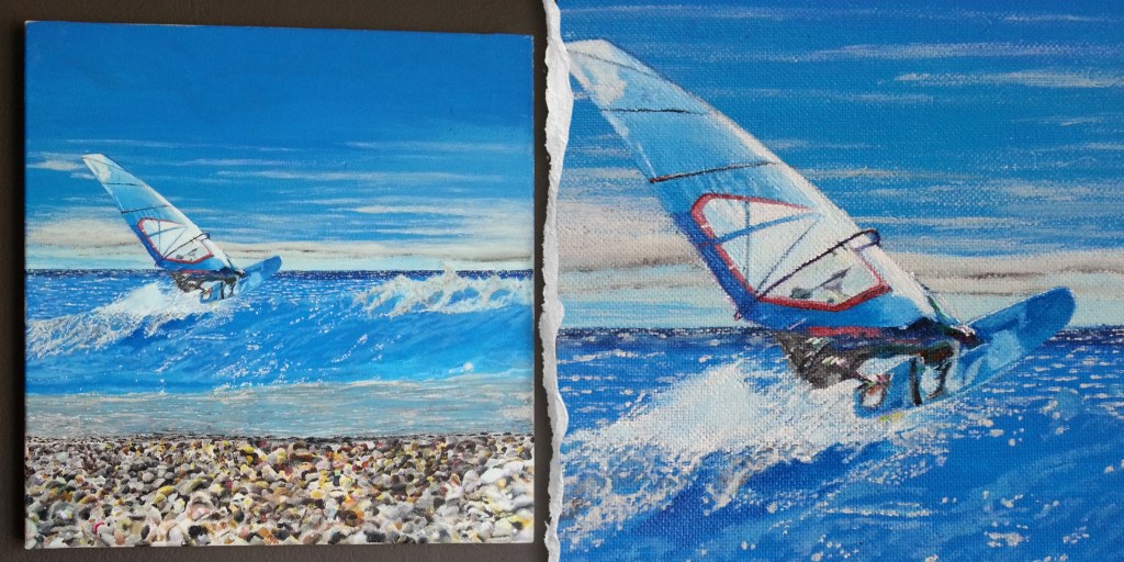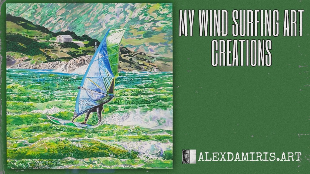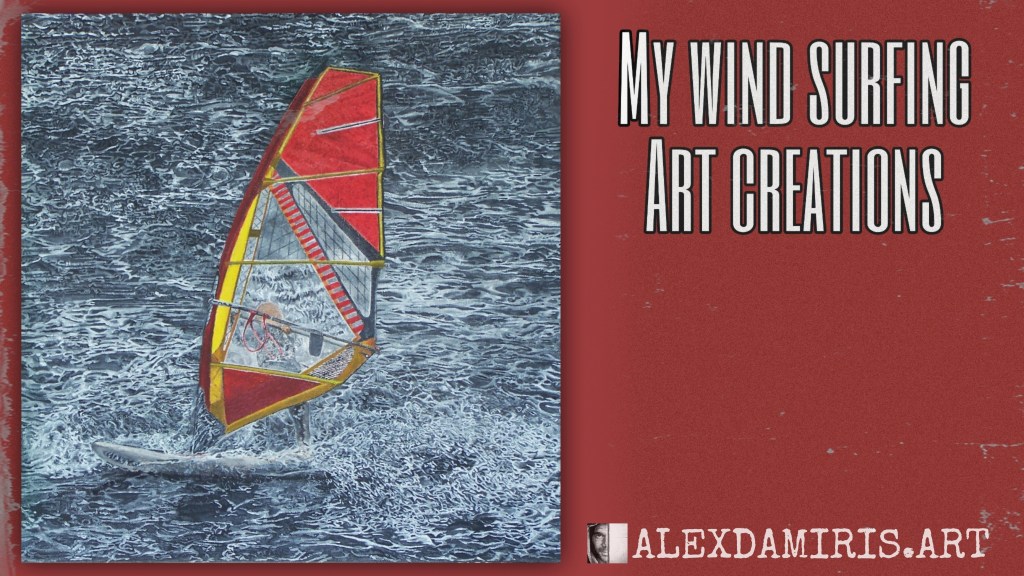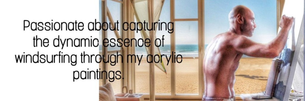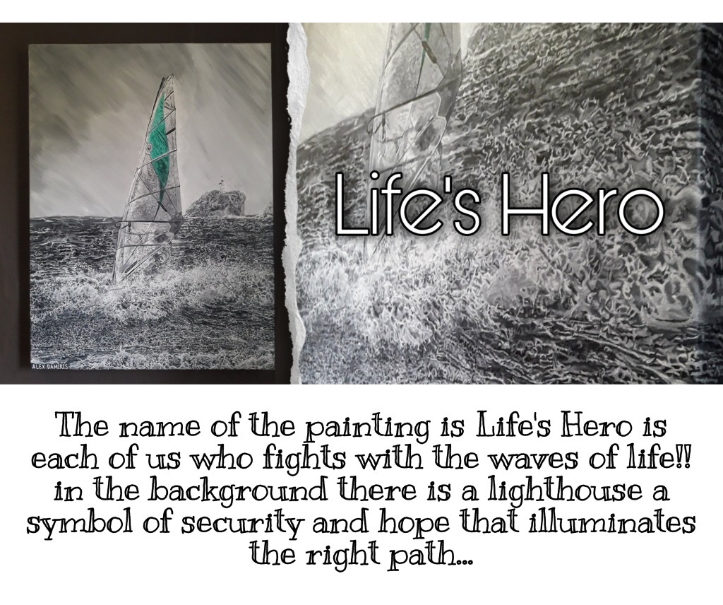 To express it in my art painting, instead of painting the surfer onto the surfboard, I painted him creating the wave with his finger to give a push to himself. In this way, I express that only we have the ability to help ourselves in what we want to achieve. The windsurfer accomplishing the big jump, and below the surfboard, the symbol of Vikings and the arrow express the success of our purpose